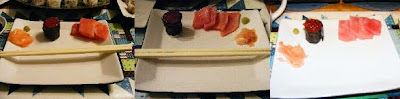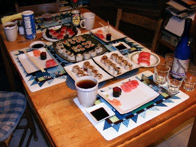 The plan this evening was to make a full on meal, complete with the brand new Ikura roe, some eel, fish, and scallops. I prepared a meal for three people. Luckily, our appetites were not quite as pronounced as in the past. Five regular rolls were enough, but I also made three battleship rolls, three tuna nigiri, and a pressed tuna roll. We also opened a bottle of some sweet sake of the fruity kind. I’m not terribly fond of sake, but I did have a little bit.