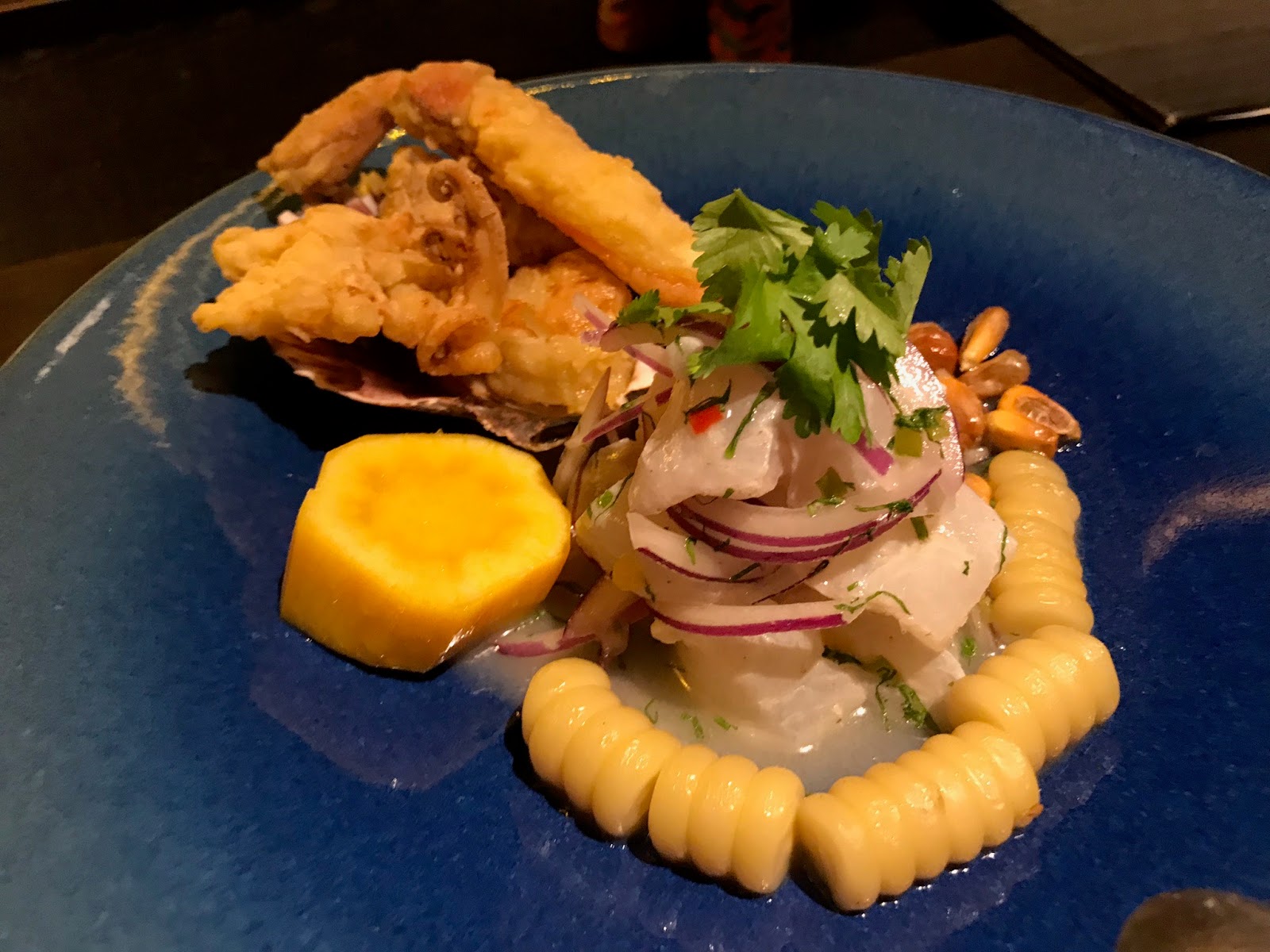 Seafood ceviche with toasted corn and assorted bits. Spicy. Very good.