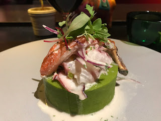 Mashed potato (green mashed potato) with crab and octopus.