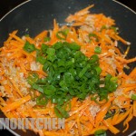 Put a little sesame oil in a pan and heat on medium, then fry the carrot, tuna, spring onion , shiitake mushrooms (without the water used to soak them) and frozen veggies together.