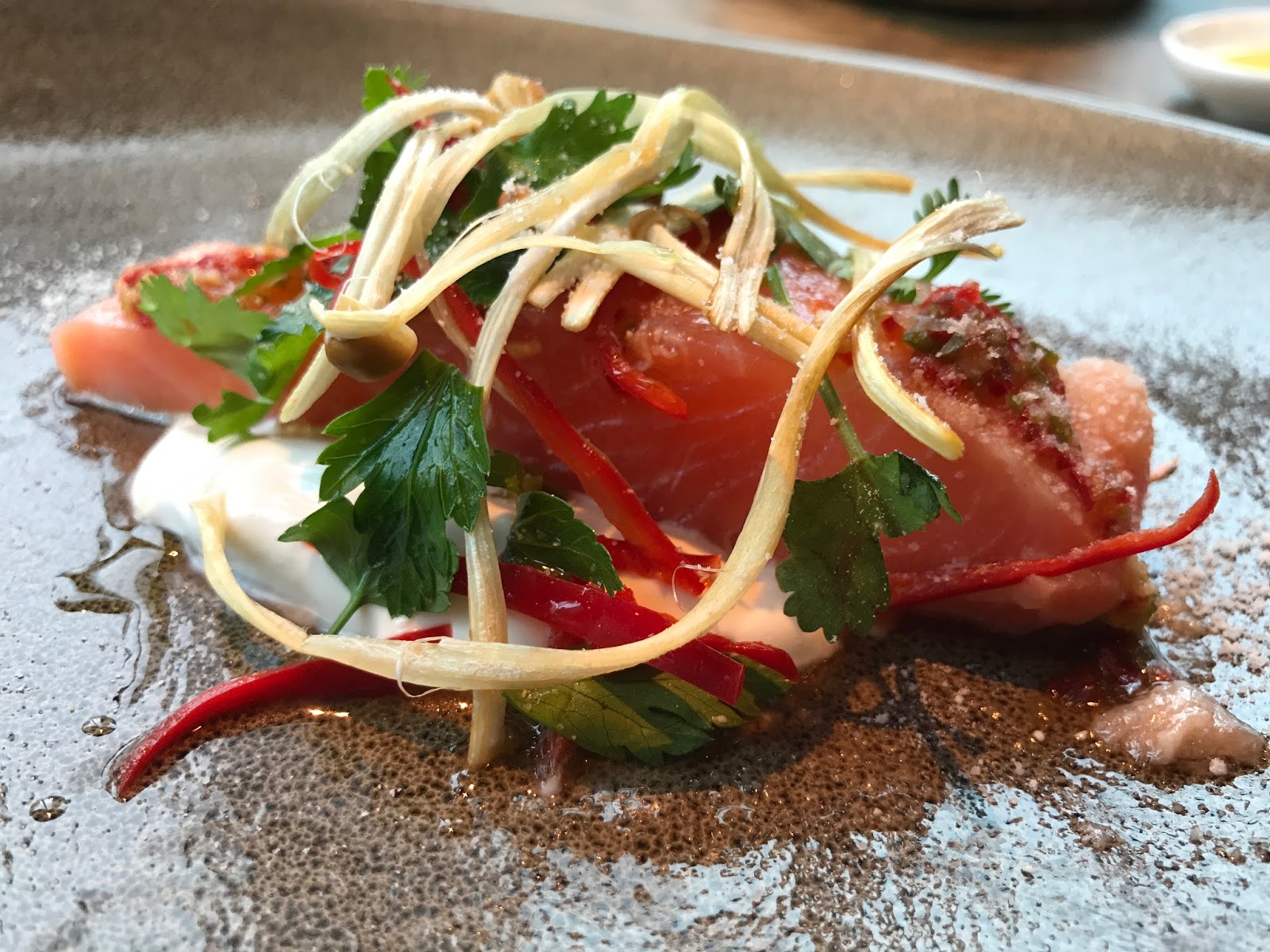 Tasmanian trout confit with coconut yoghurt and thai condiments: I love the idea of serving trout confit in a Thai style, and the coconut yoghurt is delicious. I did feel that the fish itself was a little bland and couldn’t really compete with the other flavours – my only criticism in what was otherwise an excellent dish (and meal overall)