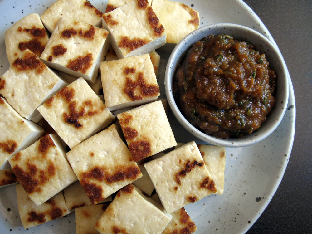 Slice Firm Tofu horizontally in half. Heat a small mount of Oil in a frying pan, and cook Tofu pieces both sides until nicely browned.To make Miso Pesto, roast or toast nuts and allow them cool. Using Suribachi or mortar & pestle, coarsely crush. Alternatively you can place the toasted nuts in a plastic bag and crush them using a rolling pin. Add other ingredients and mix well.Cut browned Tofu into smaller pieces and serve with Miso Pesto. It’s a good idea to serve with a small spoon or spreader knife.