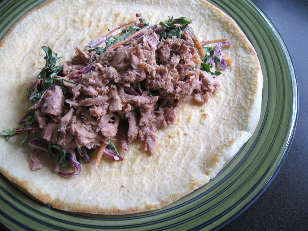 Combine all ingredients and beet with a whisk until smooth.Heat a frying pan over medium heat and lightly oil. Pour the batter onto the frying pan, tip and rotate the pan to spread batter to form a thin crepe. Cook both sides until lightly browned.The filling of the above photo is Kale Slaw and Canned Tuna with Salt & Pepper.