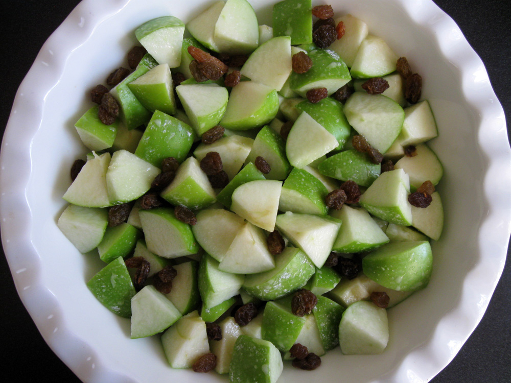 Preheat oven to 180°C.Wash Apples, remove the core and cut into about 2cm pieces. Today I cut each Apple into 8 wedges, and cut each wedge into 3 pieces.Place the Apple pieces, Sugar and Corn Flour in a baking dish, and mix to combine. Scatter Sultanas over.