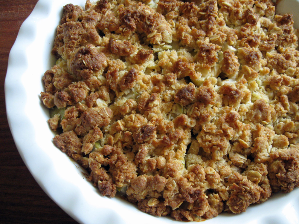To make the Crumble, place Butter in a heat-proof bowl and melt it in the microwave, add Golden Syrup and Sugar, and mix well. Add all other dry ingredients, and mix until just combined.Spoon the Crumble over the Apple. Bake for 40 minutes. When the Crumble turned too dark, cover with a sheet of foil and bake until Apple pieces are soft.Serve with whipped Cream, Custard OR Vanilla Ice Cream.