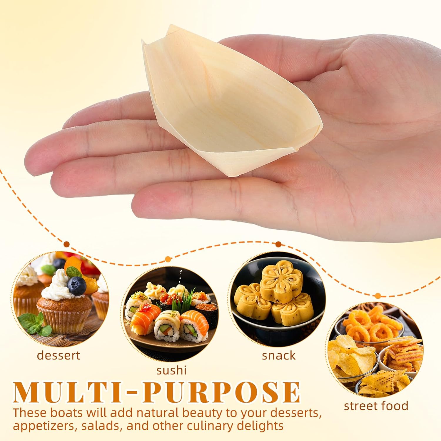 – Disposable design, no need to wash and maintain, save your time and efforts wood serving boats plates.